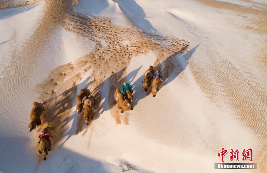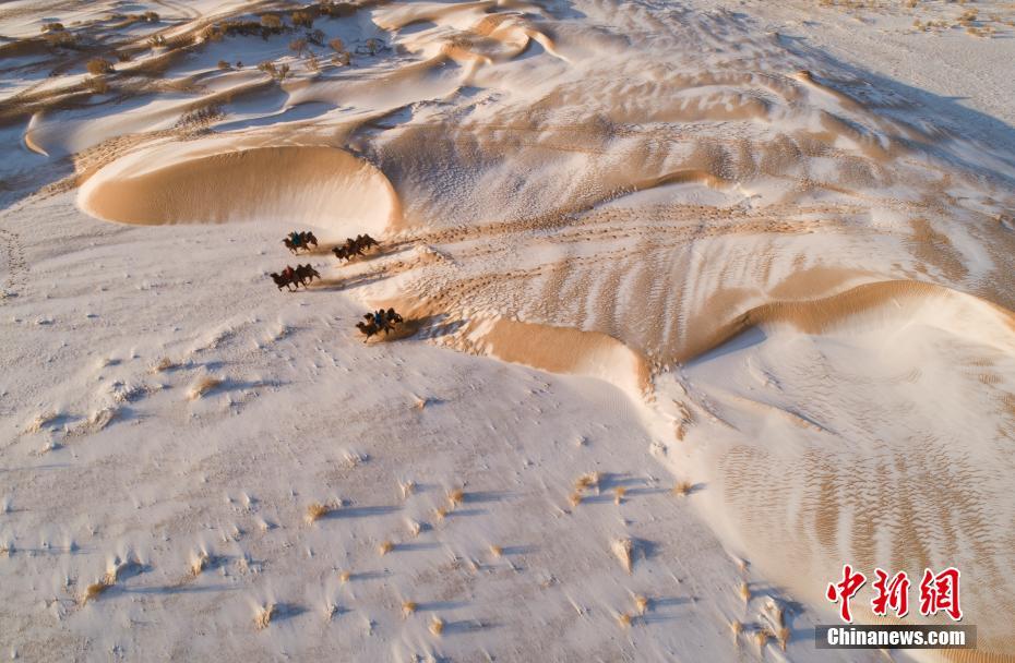 Le 29 décembre, des chameaux marchent dans le désert de Bayinwendu'er, dans la région autonome de Mongolie intérieure. Après des chutes de neige, le désert a offert aux visiteurs une vue magnifique.