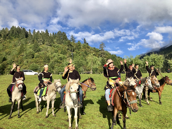 Des habitants à cheval disent au revoir aux touristes dans le district de Dragyib de la ville de Nyingchi, dans la région autonome du Tibet (sud-ouest de la Chine). (Palden Nyima / chinadaily.com.cn)