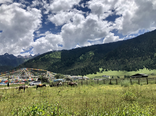 Les montagnes couvertes d'arbres descendent vers une prairie près du village de Tashigang, dans le district de Bragyib de la ville de Nyingchi, dans la région autonome du Tibet (sud-ouest de la Chine). (Palden Nyima / chinadaily.com.cn)