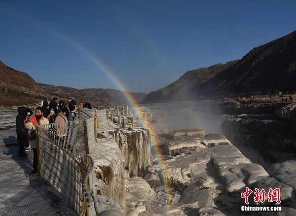 Photos prises le 14 décembre montrant des touristes admirant les paysages hivernaux du site touristique des chutes de Hukou, dans le xian de Jixian, situé dans laprovince du Shanxi (nord de la Chine). Les chutes de Hukou se trouvent à la limite des provinces du Shanxi (nord de la Chine)et du Shaanxi (nord-ouest de la Chine).