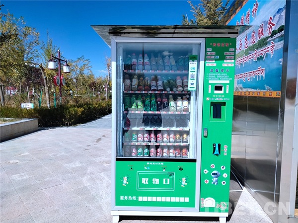 Dans le parc Qingdao de la ville de Shigatsé, dans la région autonome du Tibet, le distributeur automatique à c?té de la station de service des volontaires au milieu du parc se distingue parmi les diverses infrastructures.