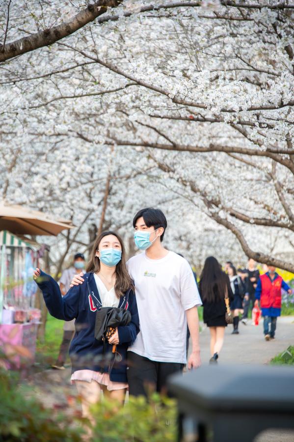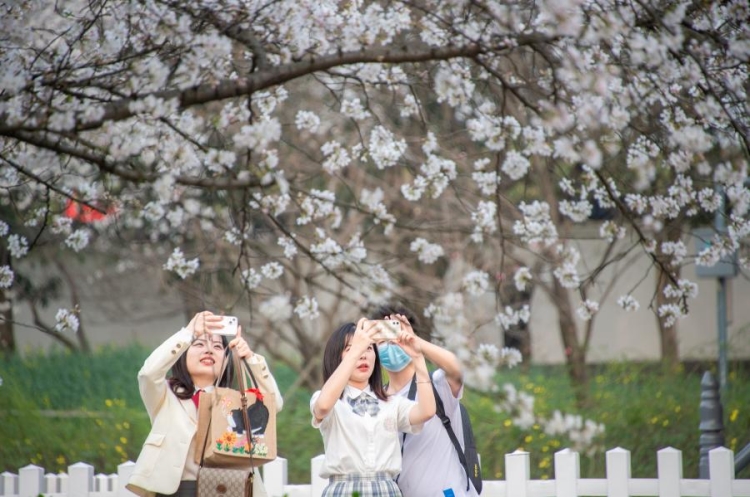 Des touristes s'amusent dans un jardin de cerisiers à Wuhan, dans la province chinoise du Hubei (centre), le 14 mars 2022. (Photo : Wu Zhizun)