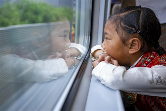 Une fillette tibétaine regarde par la fenêtre alors qu'elle est dans un train automoteur. (Xu Yuyao / Pic.people.com.cn)