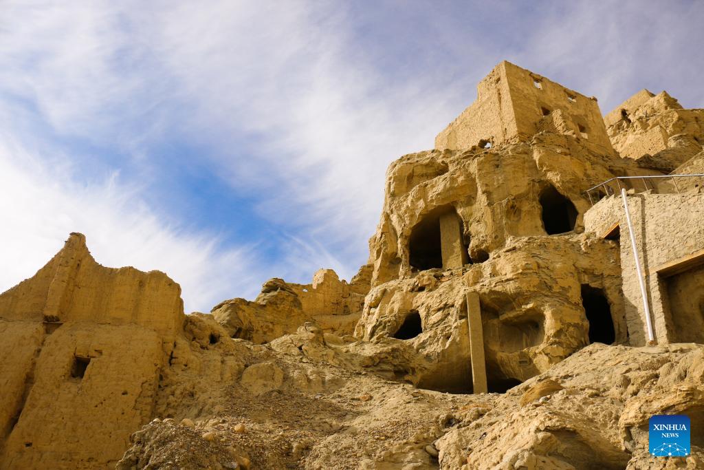 Photo prise le 3 novembre 2023 montrant le paysage des ruines du Royaume de Guge, dans le comté de Zanda de la préfecture de Ngari, dans la région autonome du Tibet (sud-ouest de la Chine). L'ancien Royaume de Guge a probablement été fondé au 10e siècle mais il a été abandonné à la fin du 17e siècle. Aujourd’hui, seules les structures de terre et de roche demeurent encore présentes, protégeant les reliques et peintures murales qu'elles abritent des éléments naturels. (Chen Shangcai / Xinhua)