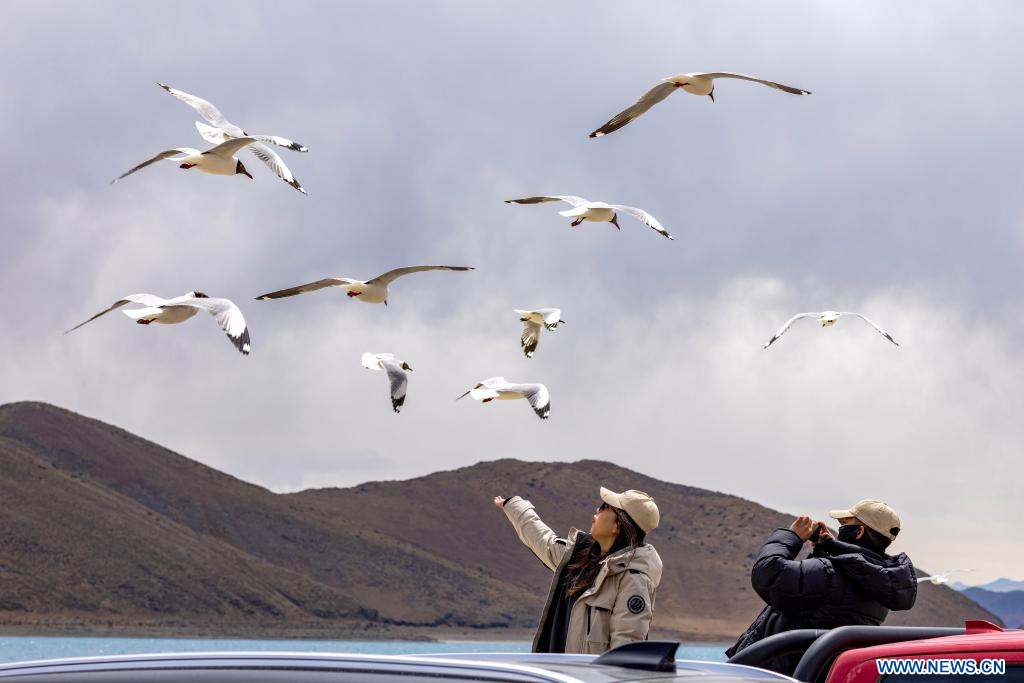 Des touristes nourrissent des mouettes du Tibet au lac Yamzbog Yumco, dans la région autonome du Xizang (sud-ouest de la Chine), le 5 avril 2024. (Photo : Jiang Fan)