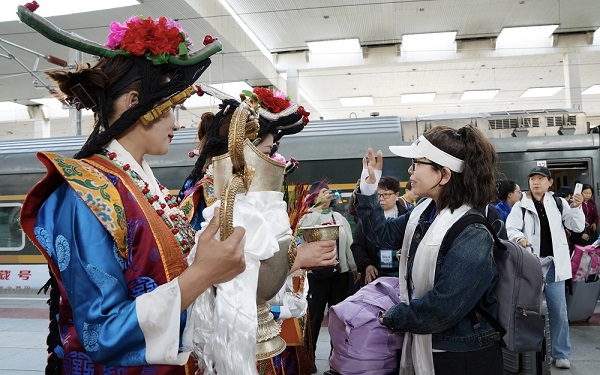 Le 22 mai à 20 heures, le très attendu train touristique ? C?ur à c?ur entre Beijing et le Xizang ? est entré lentement dans la gare de Lhassa. Lorsque le train s'est arrêté, une cérémonie de bienvenue unique s'est déroulée devant les passagers. La joyeuse danse du yak, le ? Qiema ? de bon augure et des hada blancs ont tous exprimé l'hospitalité des habitants de Lhassa, permettant aux touristes de ressentir pour immédiatement le charme unique du plateau.