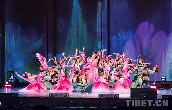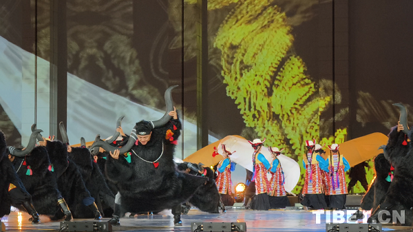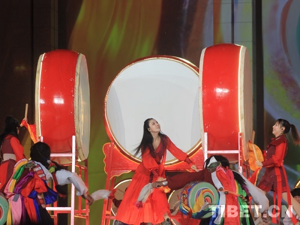 En photo : Présentation de ? Tambours de rivière ? interprétée par l'ensemble de percussions Zheyou et la troupe de danse Zhuo Jiuhe de Qonggyai de la ville de Shannan