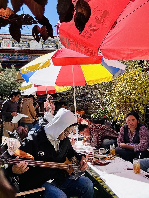 La grande cour de Kunsangtse abrite des maisons de style tibétain centenaires, qui conservent leur charme d'antan tout en affichant une vitalité renouvelée. Tenzin Tejue, qui a grandi dans cette cour, gère aujourd'hui avec des amis un café situé au coin nord-ouest du rez-de-chaussée. L'ar?me du café embaume l'air, et les clients vont et viennent, insufflant une nouvelle vie à cet ancien lieu. Pour que le café s'harmonise avec le charme historique de la cour, Tenzin a spécialement apporté de vieux objets de chez lui, tels que des tasses à thé anciennes, des tables et un vieux téléviseur. Au centre de la cour, des tables et des bancs sont soigneusement disposés pour permettre aux résidents de se reposer et de discuter. Sous le soleil, les ar?mes de tsampa et de thé sucré se mêlent aux chaleureuses conversations quotidiennes, créant une ambiance empreinte de douceur et de sérénité.