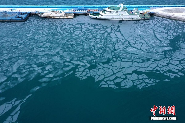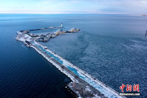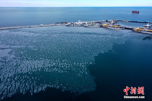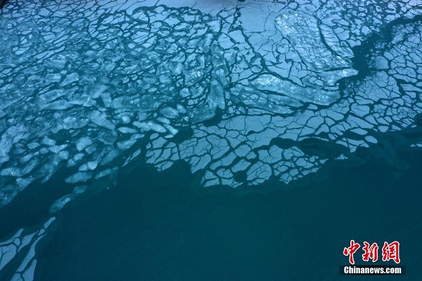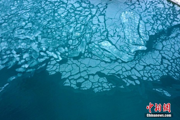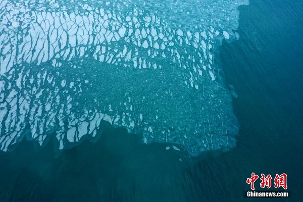 En décembre, des prises de vue aériennes de la zone touristique d'Erlangjian du lac Qinghai, située dans la préfecture de Hainan, dans la province du Qinghai, révèlent que le lac, surnommé ? la perle du plateau ?, commence à geler. Ce paysage glacé offre une vue d'hiver magnifique, attirant de nombreux touristes.