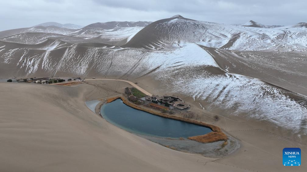 Photo aérienne prise par un drone montrant le site touristique du mont Mingsha et de la source du croissant à Dunhuang, dans la province du Gansu (nord-ouest de la Chine), le 23 novembre 2024. (Zhang Xiaoliang / Xinhua)