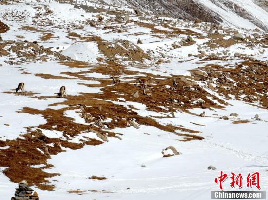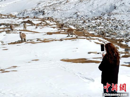 En mars, au pied des pics enneigés de Gangshka, situés dans le comté autonome hui de Menyuan, dans la préfecture autonome tibétaine de Haibei, dans la province du Qinghai, des touristes s'arrêtent au lac Lianxin pour prendre des photos souvenirs. Ces dernières années, la gouvernance écologique au Qinghai s'est constamment améliorée, favorisant un environnement de plus en plus équilibré, des espèces sauvages tels que le bharal et le tétraogalle tibétain apparaissent fréquemment, offrant aux touristes la possibilité d'interagir de près avec la faune locale.
