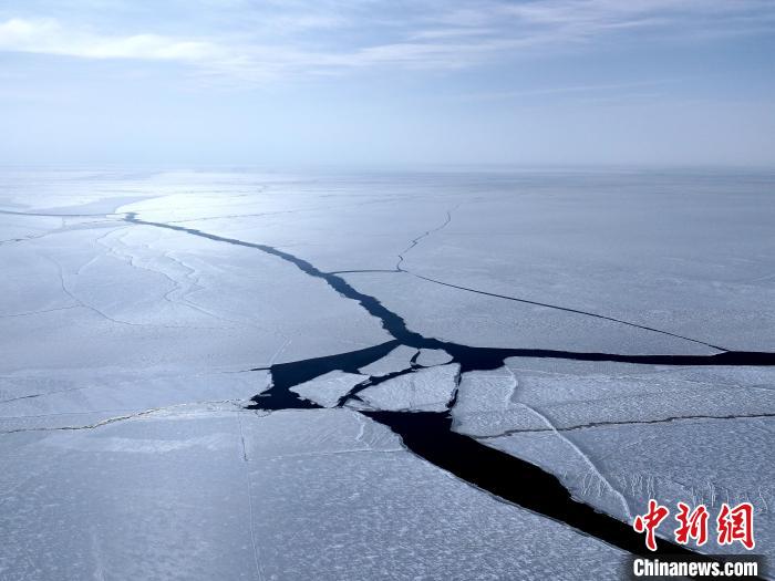 Photo aérienne de la surface gelée du lac Qinghai en train de se fissurer.