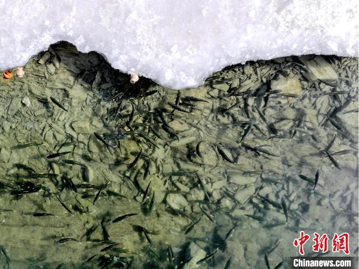 Photo aérienne de carpes nues du lac Qinghai visibles à travers la glace craquelée du lac.