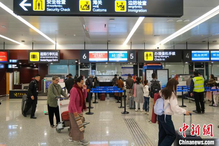 Le 31 mars, à l'aéroport international Gonggar de Lhassa, des passagers en partance pour Pokhara enregistrent leurs bagages avant le vol inaugural.