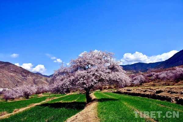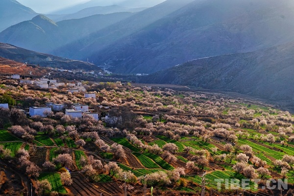 Une belle harmonie entre maisons traditionnelles tibétaines blanches et pêchers en fleur