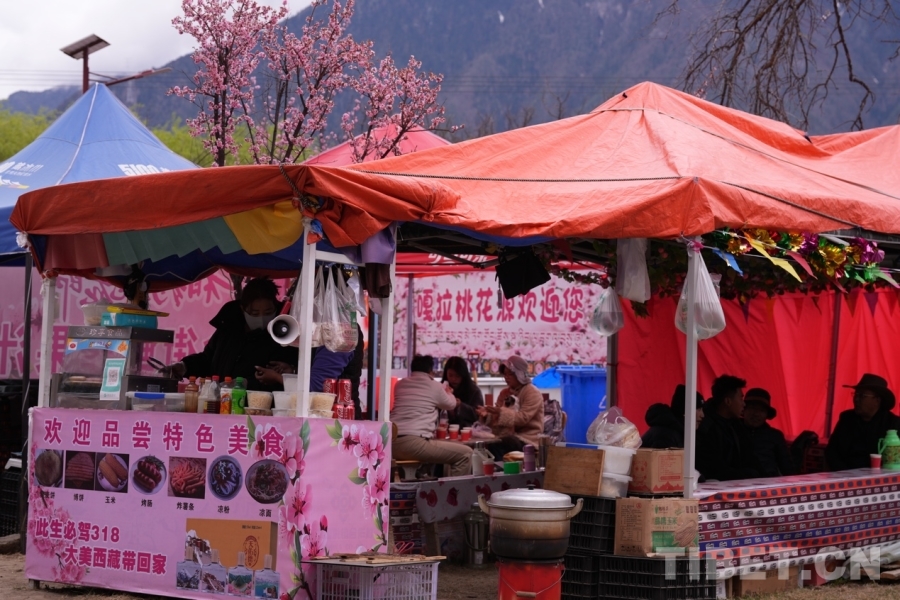 Dans la forêt de pêchers, les visiteurs peuvent faire du cheval, monter un yak, tirer à l'arc, se faire photographier en costume tibétain, et participer à d'autres programmes de divertissement, mais aussi boire du café, du thé au beurre de yak, go?ter à la cuisine tibétaine, aux brochettes d'agneau du Xinjiang, ainsi qu'à diverses collations. Parmi les exploitants de ces activités, on compte à la fois des villageois locaux et des personnes venues d'ailleurs. Au village des fleurs de pêcher de Kala, tout est réuni pour manger, boire et se divertir dans la bonne humeur.
