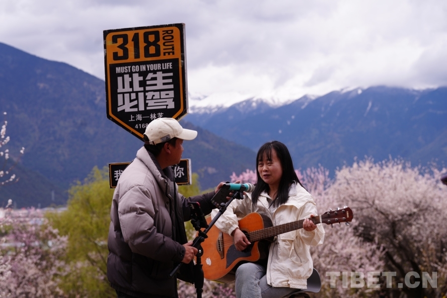 Sous les pêchers en fleur, en montant les escaliers vers un belvédère, le panneau ? La route 318, à faire au moins une fois dans sa vie ? attire l'attention pour une photo souvenir, des visiteurs, s'asseyant sur des bancs à proximité, peuvent prendre une guitare, pour chanter leurs émotions face au micro ; les montagnes enneigées et la forêt dense à l'horizon, et les fleurs de pêcher blanches et roses et les champs de crucifères dorés au premier plan, composent un somptueux tableau printanier, de sorte que les visiteurs se laissent aller au son de la chanson et à la beauté de la scène, Yuan Baolu est justement en train de capturer ce moment en vidéo.