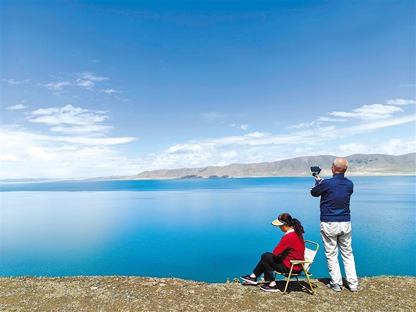 Des touristes admirent le paysage au lac Bamu tso, dans le comté de Bangoin.
