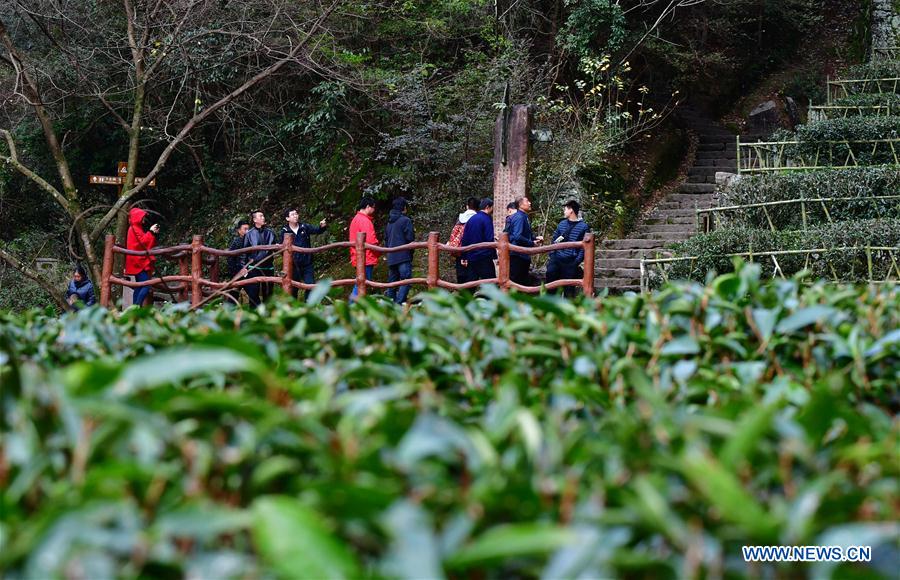 La photo prise le 18 janvier 2019 montre que des touristes profitent du paysage du site pittoresque du mont Wuyi, dans la province chinoise du Fujian (sud-est).