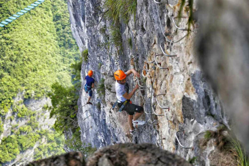 D'après le gouvernement, les touristes peuvent découvrir des paysages époustouflants en escaladant la montagne par les balustrades en acier, un cable de vie ou d'autres équipements et même ceux qui n'ont pas d'expérience de l'escalade peuvent monter une falaise abrupte en toute sécurité.