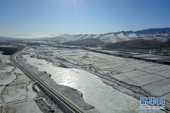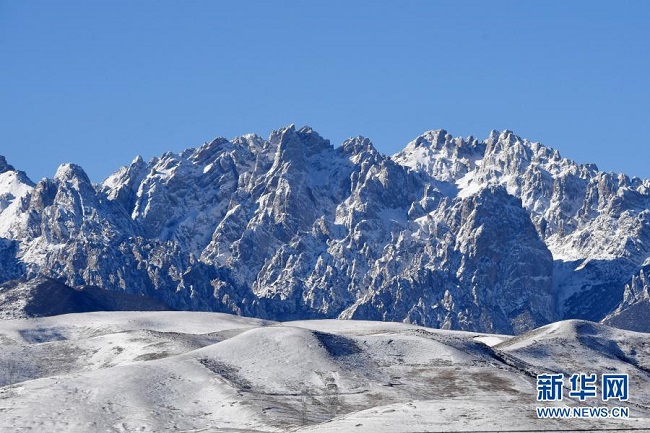 Photo prise le 17 janvier, montrant les paysages hivernaux du mont Wuqiao, qui se situe à Wuwei, dans la province du Gansu (nord-ouest). Le mont Wuqiao, qui fait partie de la cha?ne des monts Qilian, dévoile un charme enchanteur avec ses sommets couverts de neige. (Photos : Fan Peikun/Xinhua)