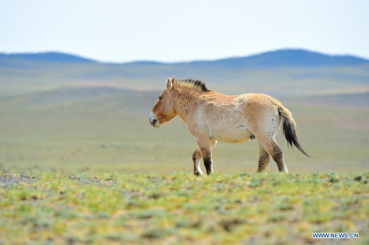 Des chevaux de Przewalski, vus dans la réserve naturelle de Kalamayli, dans la région autonome ou?ghoure du Xinjiang (nord-ouest de la Chine), le 22 avril 2021.