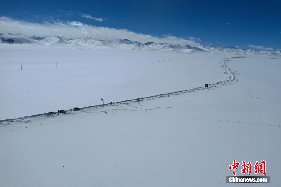 Namtso est l'un des trois lacs sacrés du Tibet. Il a neigé récemment dans cette région. Le lac gelé et les vastes paturages sont tous recouverts de neige. Les montagnes au loin ressemblent à de la crème glacée. Les balustrades du paturage cernent le contour des prairies.