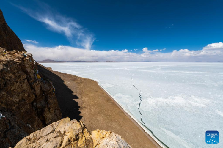 Photo aérienne prise le 24 mars 2022 montrant une vue du lac gelé Serling Tso à Nagqu, dans la région autonome du Tibet (sud-ouest de la Chine). (Kelsang Namgyai / Xinhua)