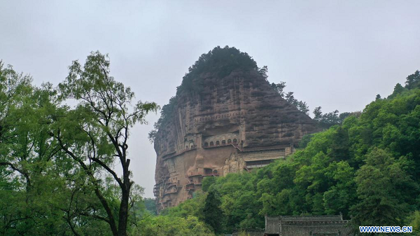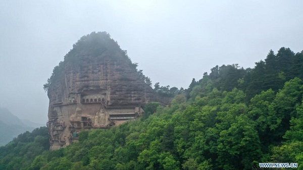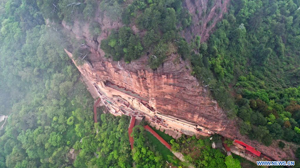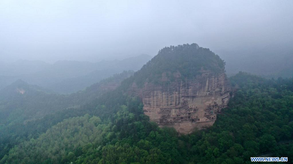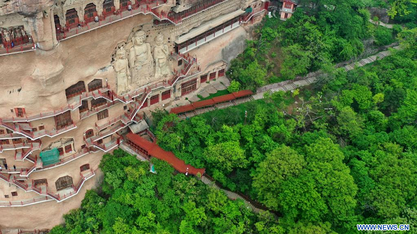Vue des grottes du mont Maiji à Tianshui, dans la province chinoise du Gansu (nord-ouest), le 29 avril 2022. (Xinhua/Chen Bin)