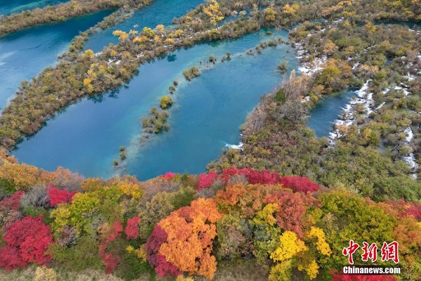 Le 23 octobre, à la fin de l'automne, Jiuzhaigou, au Sichuan, ressemble à une peinture à l'huile. Des feuilles rouges colorées partout dans les montagnes et les plaines se complètent avec l'eau cristalline du lac.