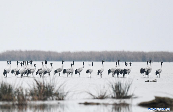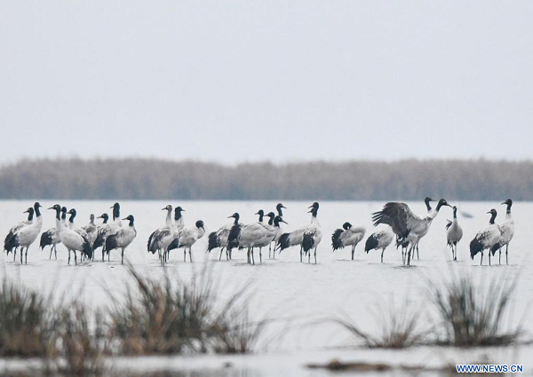 Des grues à cou noir dans la Réserve naturelle nationale de Caohai dans le district autonome Yi, Hui et Miao de Weining, dans la province chinoise du Guizhou (sud-ouest), le 4 novembre 2022. (Xinhua/Yang Wenbin)