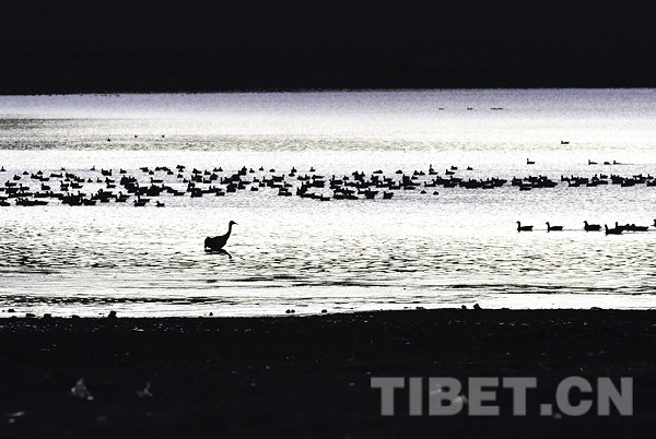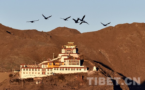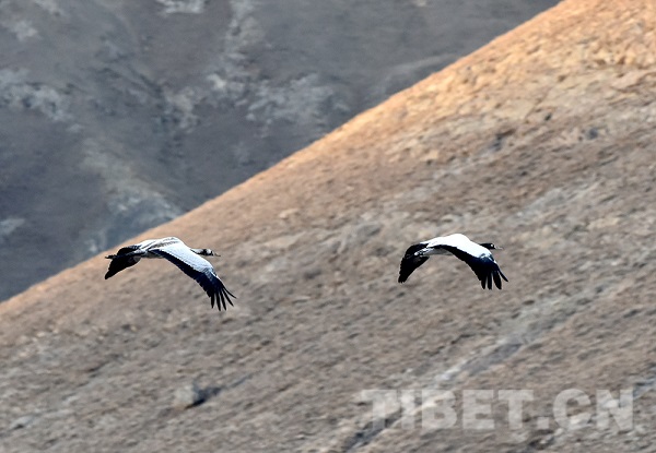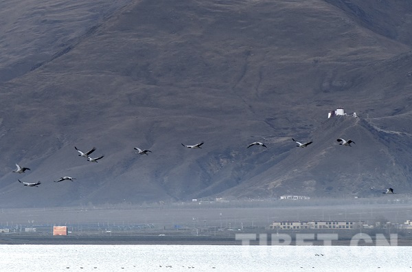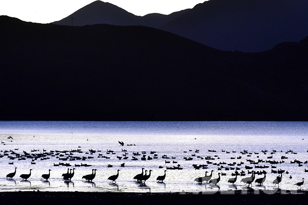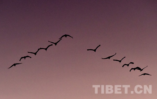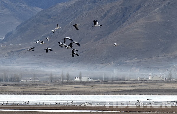 L'hiver est arrivé, et on entend les grues. Les grues à cou noir sont arrivées au réservoir de la montagne Hutou dans le district de Lhundrup, ville de Lhassa, région autonome du Tibet pour l'hiver. Au crépuscule du matin, le village non loin de là est couvert de couches de brume. Les oiseaux migrateurs tels que les grues à cou noir et les tadornes rouges qui se perchent au réservoir de la montagne Hutou la nuit se réveillent au milieu des éclats de chant et déploient leurs ailes s'envoler vers les champs environnants pour se nourrir. Le réservoir de la montagne Hutou est entouré de montagnes d'une vaste zone de terres fertiles, ce qui en fait un bon lieu d'hivernage pour les grues à cou noir. Chaque année à la mi-octobre, des groupes de grues à cou noir viennent ici pour passer l'hiver, présentant une image émouvante de la coexistence harmonieuse de l'homme et de la nature.