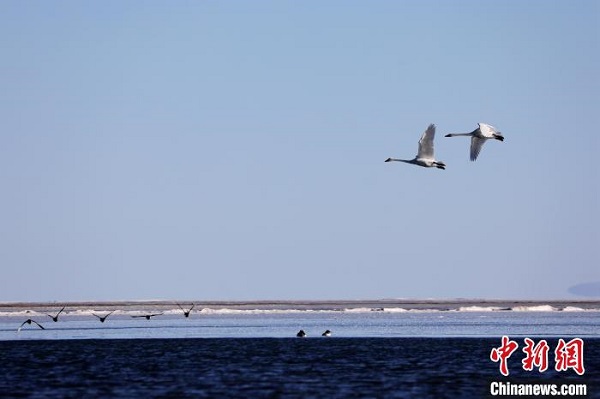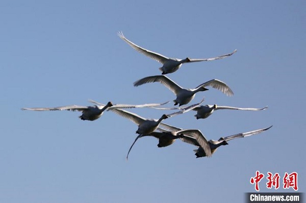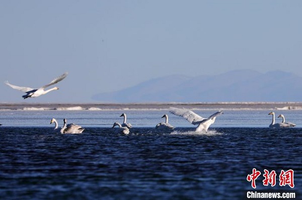 Le 17 décembre, des photographes ont capturé un groupe de cygnes chanteurs en vol et en croisière dans la région de Quanwan du lac Qinghai. Chaque hiver, le lac Qinghai accueille des centaines de cygnes chanteurs qui viennent passer l'hiver. Le lac Qinghai n'est pas seulement un plan d'eau important pour maintenir la sécurité écologique du nord-est du plateau Qinghai-Tibet, mais aussi une barrière naturelle pour contr?ler la propagation de la désertification de l'ouest vers l'est. C'est aussi l'intersection des deux itinéraires des migrations d'oiseaux migrateurs en Asie centrale et en Asie de l'Est.