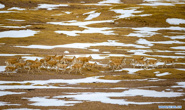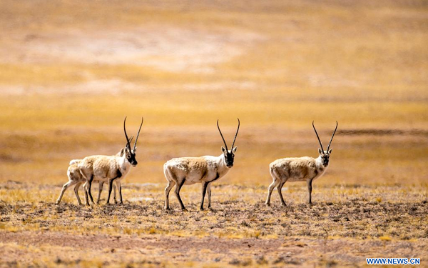 Des antilopes tibétaines observées dans la Réserve naturelle nationale de Qiangtang, dans la région autonome du Tibet (sud-ouest de la Chine), le 17 avril 2023. (Xinhua/Guan Minghui)