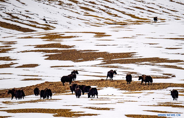 Des yaks sauvages observés dans la Réserve naturelle nationale de Qiangtang, dans la région autonome du Tibet (sud-ouest de la Chine), le 17 avril 2023. (Xinhua/Jiang Fan)