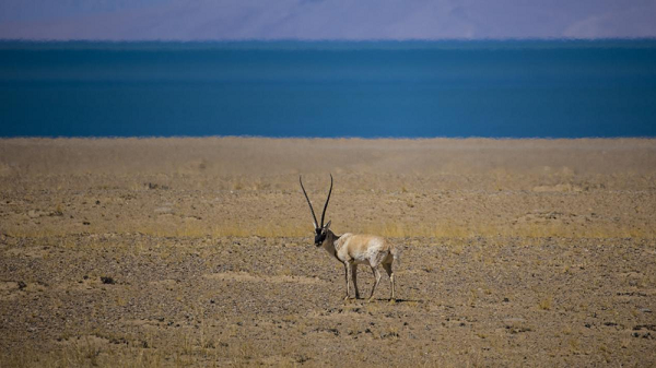 En photo : Groupe d'antilopes tibétaines au bord du lac de Serling