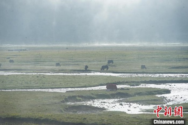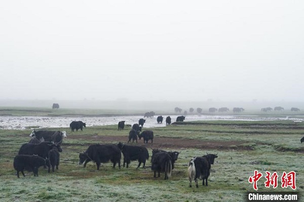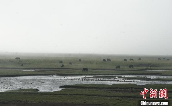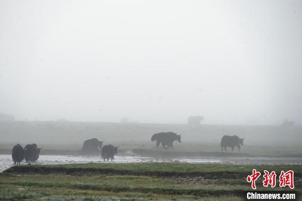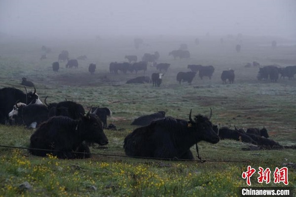 Au petit matin du 20 juillet, la plage de Nyanpo, district de Jigzhi, préfecture autonome tibétaine de Golog, province de Qinghai, était brumeuse et pleine de brouillard. Des groupes de yaks appartenant aux bergers cherchaient de la nourriture et se promenaient dans le brouillard, ressemblant à de belles peintures à l'encre. La plage de Nyanpo, située au nord de Nyanpo Yutse, couvre une superficie de 36 kilomètres carrés. Les quatre saisons sont riches en eau et en herbe, le bétail est partout et les bergers vivent ici depuis des générations.