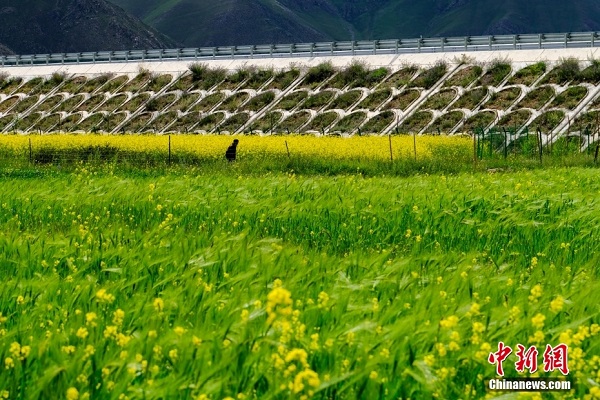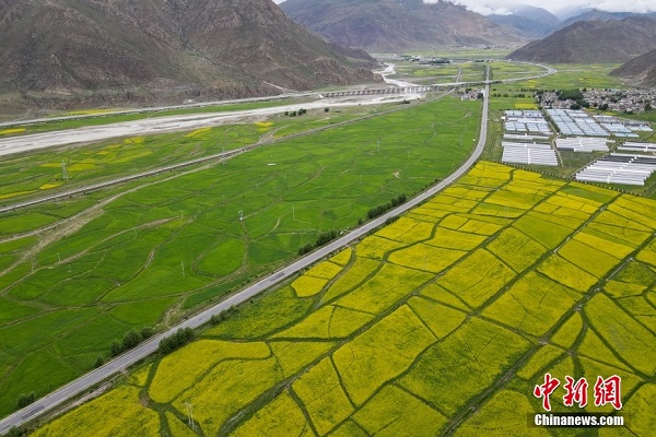 • Toujours un go?t de printemps en juillet : les fleurs de colza sont en pleine floraison des deux c?tés de Doilong Qu, au Tibet