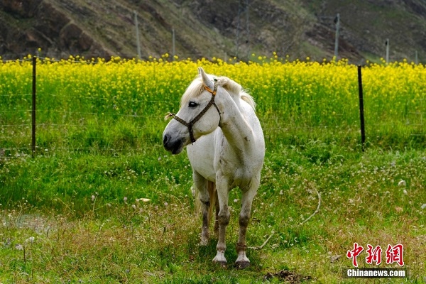 Champs de colza et un cheval blanc de haute altitude.