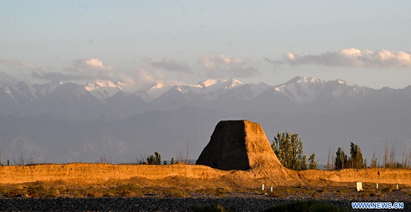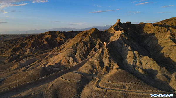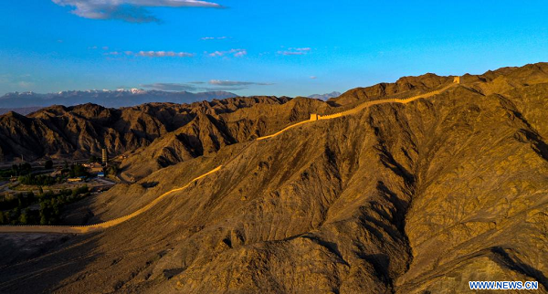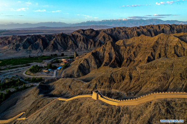 Photo prise le 14 juillet 2023 montrant une partie de la Grande Muraille dans le village de Yemawan du bourg de Xincheng, à Jiayuguan, dans la province chinoise du Gansu (nord-ouest). (Xinhua/Liu Jinhai)