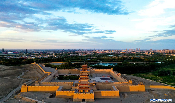 Photo aérienne prise le 13 juillet 2023 montrant la Passe de Jiayu, une section célèbre de la Grande Muraille, à Jiayuguan, dans la province chinoise du Gansu (nord-ouest). (Xinhua/Chen Zhonghao)