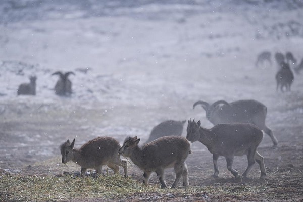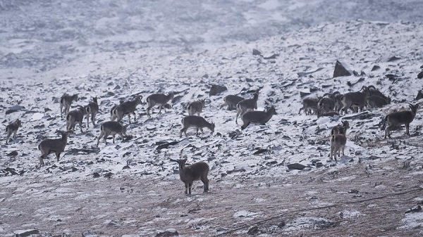 Prise de vue de moutons bleus sur le mont Ganshika. (Photo : Geng Huihuang)