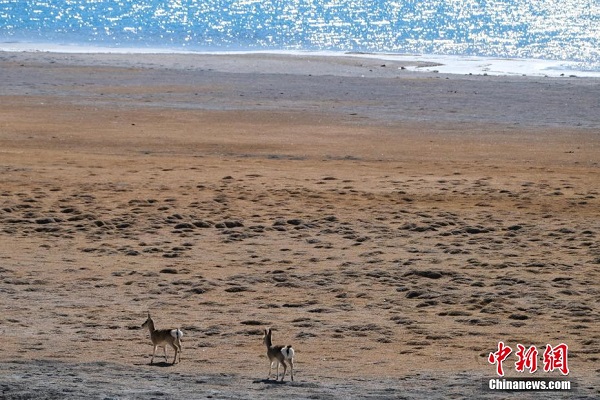 Au bord du lac Yamzhog Yumtso, deux jeunes gazelles tibétaines cherchent de la nourriture.