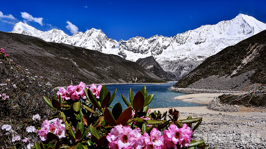 Ainsi, la majesté des montagnes enneigées, la pureté des lacs glacés, et les champs de fleurs s'épanouissant sur les prairies créent une harmonie infinie, apportant une vitalité sans fin au haut du plateau enneigé. Se promener dans cet endroit, c'est comme se déplacer à travers un tableau de paysages.