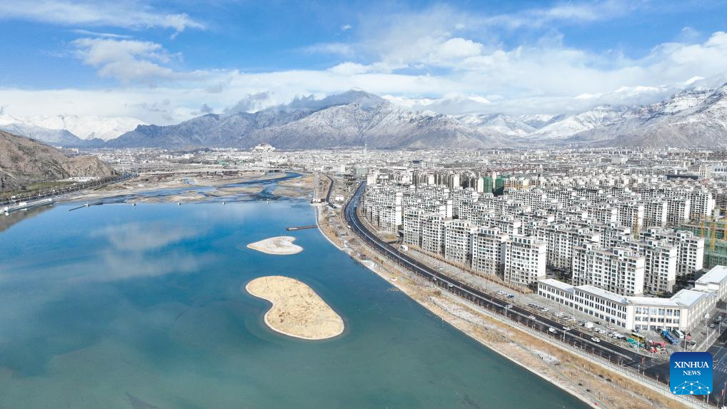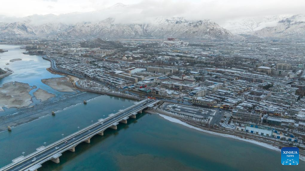 Photo aérienne prise par un drone le 16 février 2025 montrant le paysage enneigé du Palais du Potala à Lhassa, capitale de la région autonome du Xizang (sud-ouest de la Chine). (Tenzin Nyida / Xinhua)