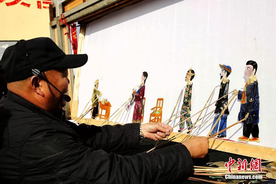 Le 26 janvier, un théatre de jeu d'ombres traditionnel dans la province du Qinghai se promène dans les rues et les ruelles, dans la ville de Danma du comté autonome du peuple Tu de Huzhu, sous le son des gongs.
