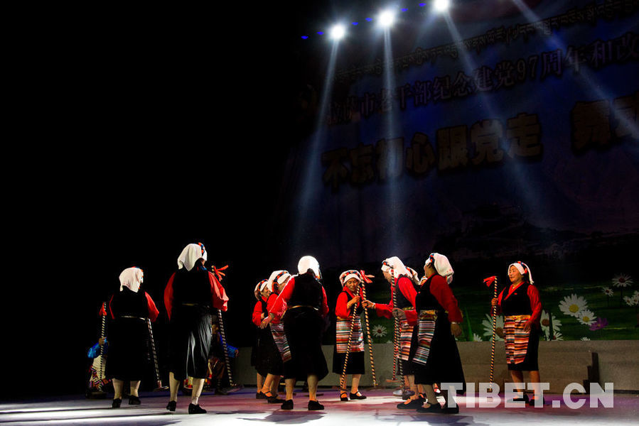 Le soir du 27 juin, l’Association d’entra?nement physique des personnes agées du Tibet et l'Association artistique des personnes agées de Lhassa ont mis en scène un spectacle énergique et coloré afin de célébrer le 97e anniversaire de la fondation du Parti communiste de Chine et la 40e année de la Réforme économique chinoise.