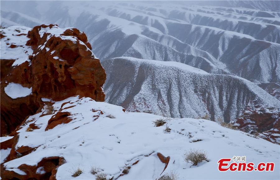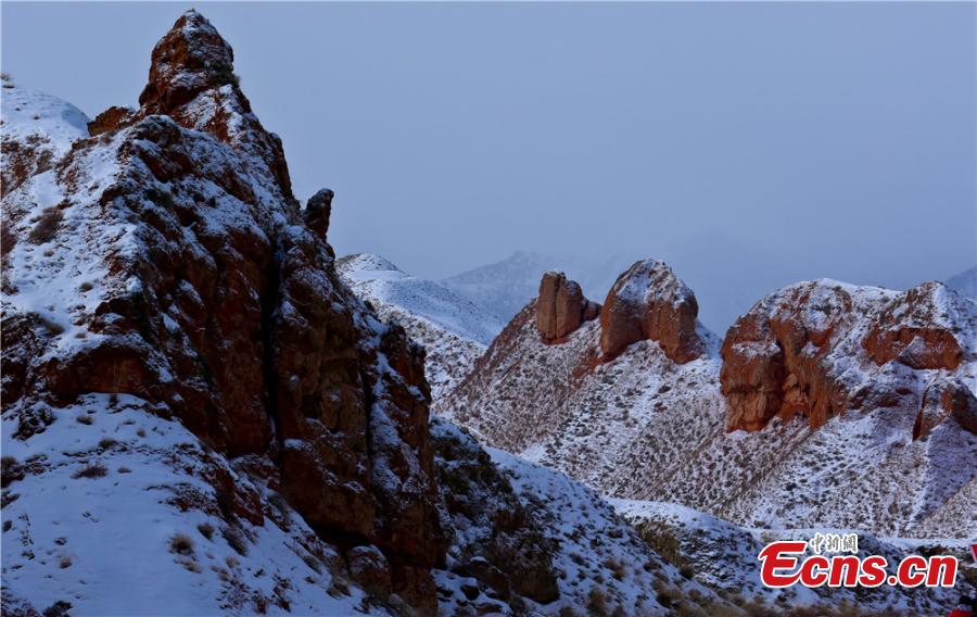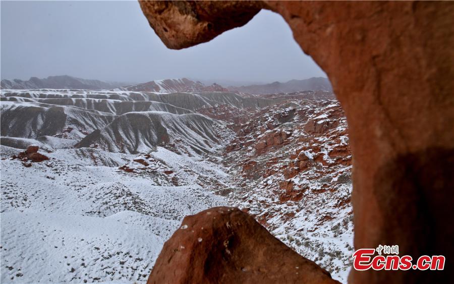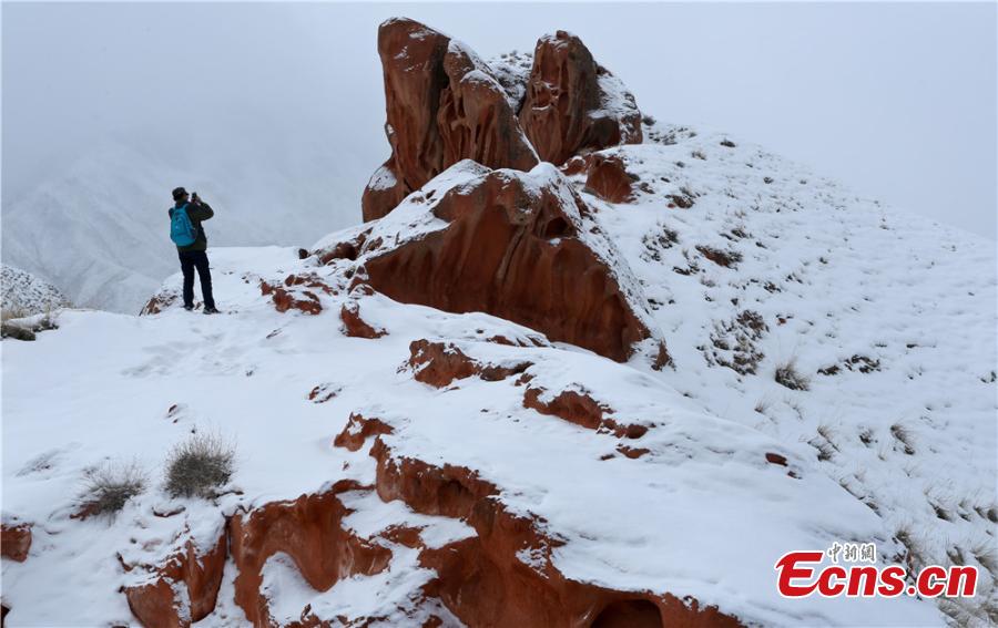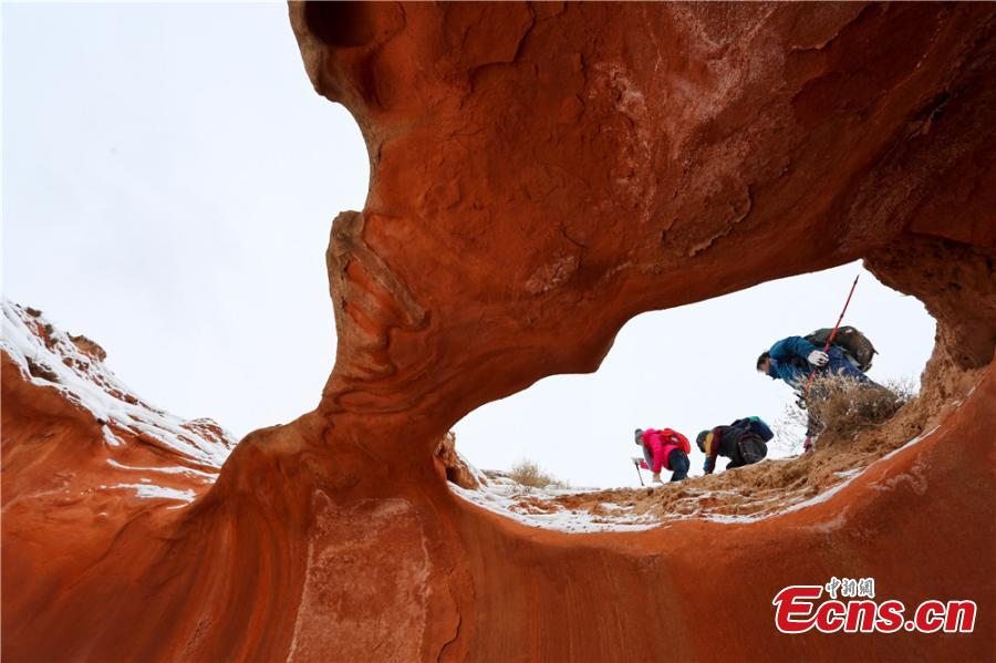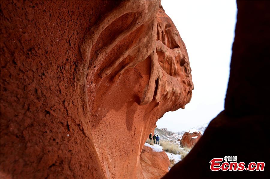 Des touristes visitent les reliefs Danxia enneigés dans le comté autonome Yugurde Sunan, dans la province du Gansu(nord-ouest de la Chine), pendant les vacances de la fête du Printemps. Les reliefs Danxia sont un type unique de géomorphologie formé de grès de couleur rouge et caractérisé par des falaises abruptes.