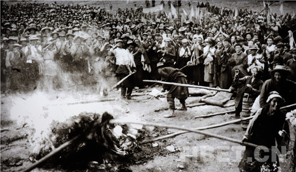 à l’été 1959, dans les cantons de Tajie et de Zhanduo, comté de Taktse, ville de Lhassa, les serfs libérés ont br?lé les baux, les actes et les dettes.