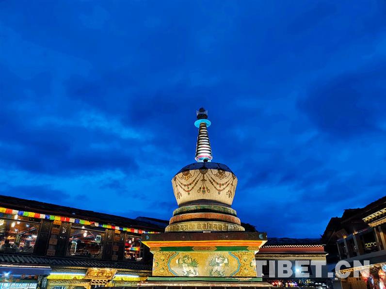 En juillet, la Préfecture autonome tibétaine de Diqing, dans la province du Yunnan, bénéficie d'un climat frais et de paysages magnifiques. à la tombée de la nuit, on peut faire une promenade dans la ville antique de Dukezong, dans le comté de Shangri-La, pour faire l'expérience de cette ancienne ville durant la nuit. La tour blanche de la vieille ville.
